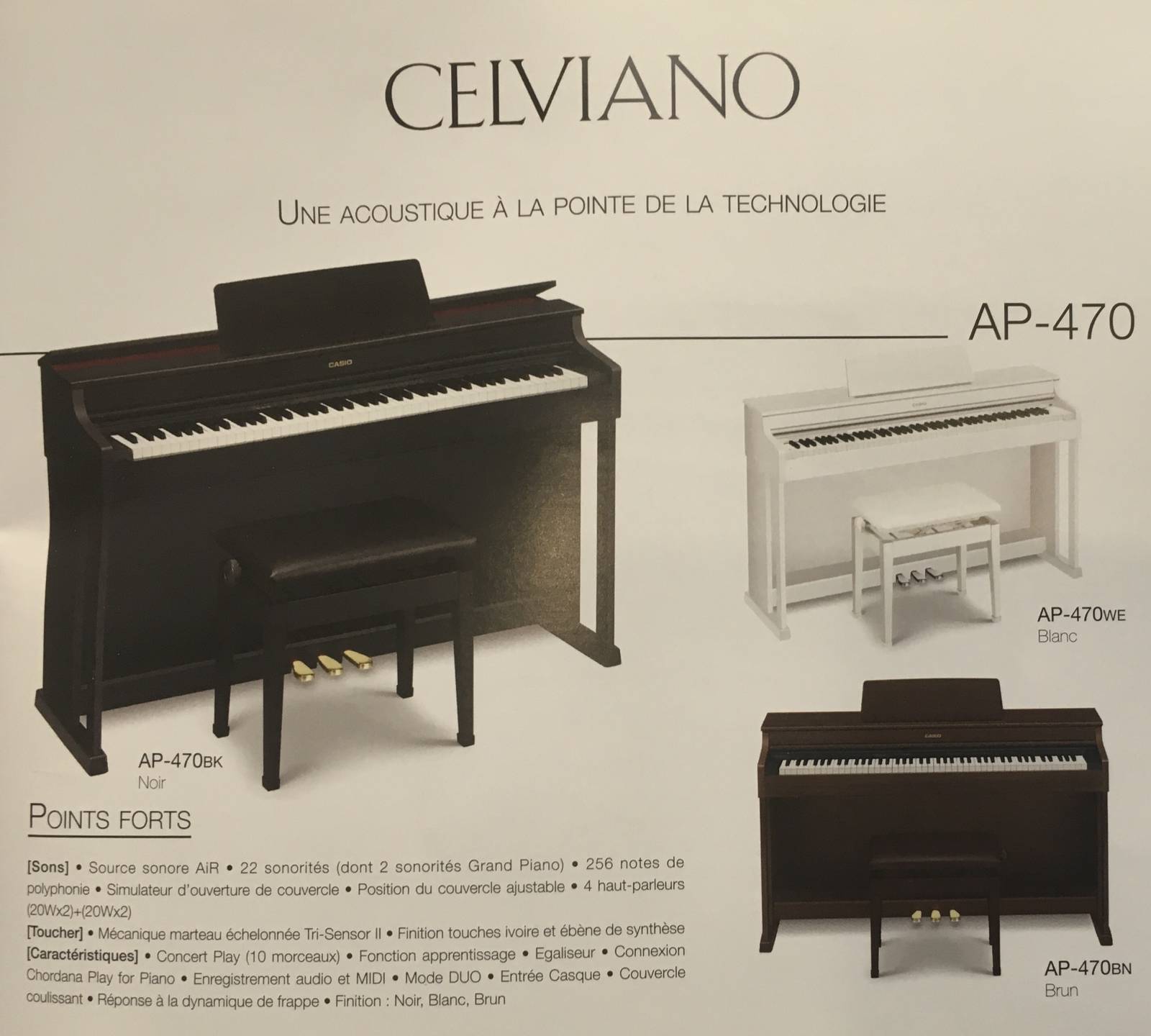 Jouez sur un piano prêt pour les plus hauts niveaux de performance. Le piano numérique Casio AP 470 est l'un des nouveaux pianos Celviano révolutionnaires de Casio. Cette gamme a époustouflé les musiciens avec deux voix de piano à queue de concert, échantillonnées à la perfection grâce à l'impressionnante technologie AiR. Ces deux sonorités vous offrent le piano idéal pour les styles classiques et contemporains.
